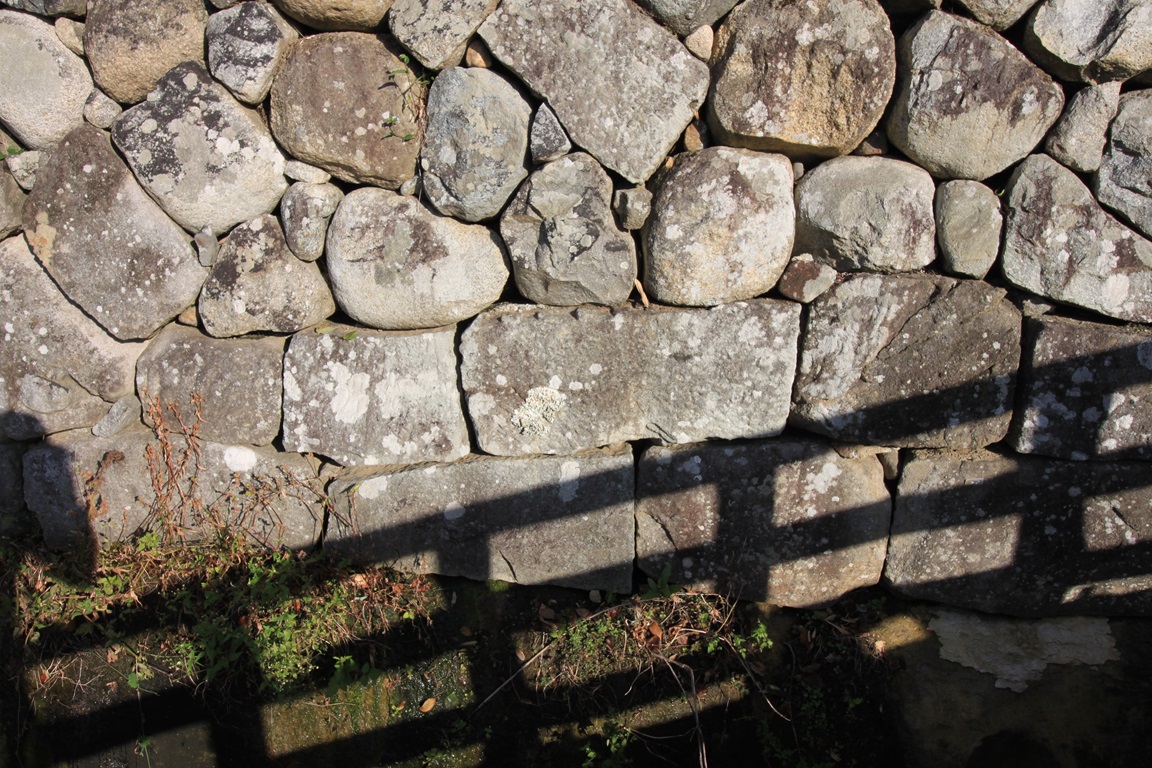 本丸の西南、黒橋付近に石垣を見る事ができます。石垣の下から2段までは遺構の感じがしますね、その上に積まれているのは恐らく近代の修復だと思います。